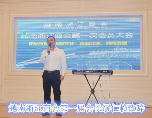 伴随着热烈掌声,缪会长步上前台向全体会员致辞并感谢各位浙江老乡的信任和支持推选成为越南浙江商会首届创会会长。他说:“近年来中越关系保持良好发展势头,两国高层交往频繁,双方正积极推动“一带一路”和“两廊一圈”合作有效对接,中国已连续十年成为越南最大贸易伙伴,浙江企业不断在越南增加投资,越南浙江商会的凑备与成立也是顺应目前的国际形势,为广大在越南浙商提供互帮互助,信息共享的平台,不断壮大我们浙商在海外的发展”。